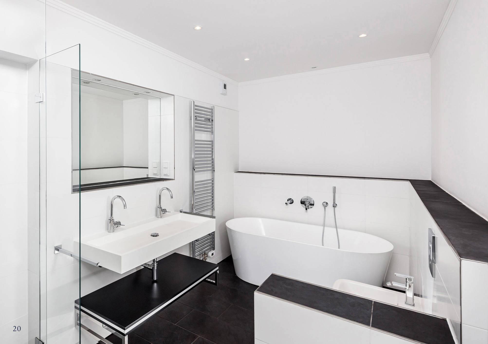 In jedem Townhouse gibt es drei Bäder. Im Obergeschoss, als Teil des Masterbereichs, das Masterbad mit freistehender Badewanne, Doppelwaschbecken darüber eine extra beleuchtete Niesche mit Spiegel und Ablage, Handtuchhalter und Ablage neben bzw. unter dem Waschtisch, Toilette, Bidet und separater Regen-Dusche und Handtuchwärmer.