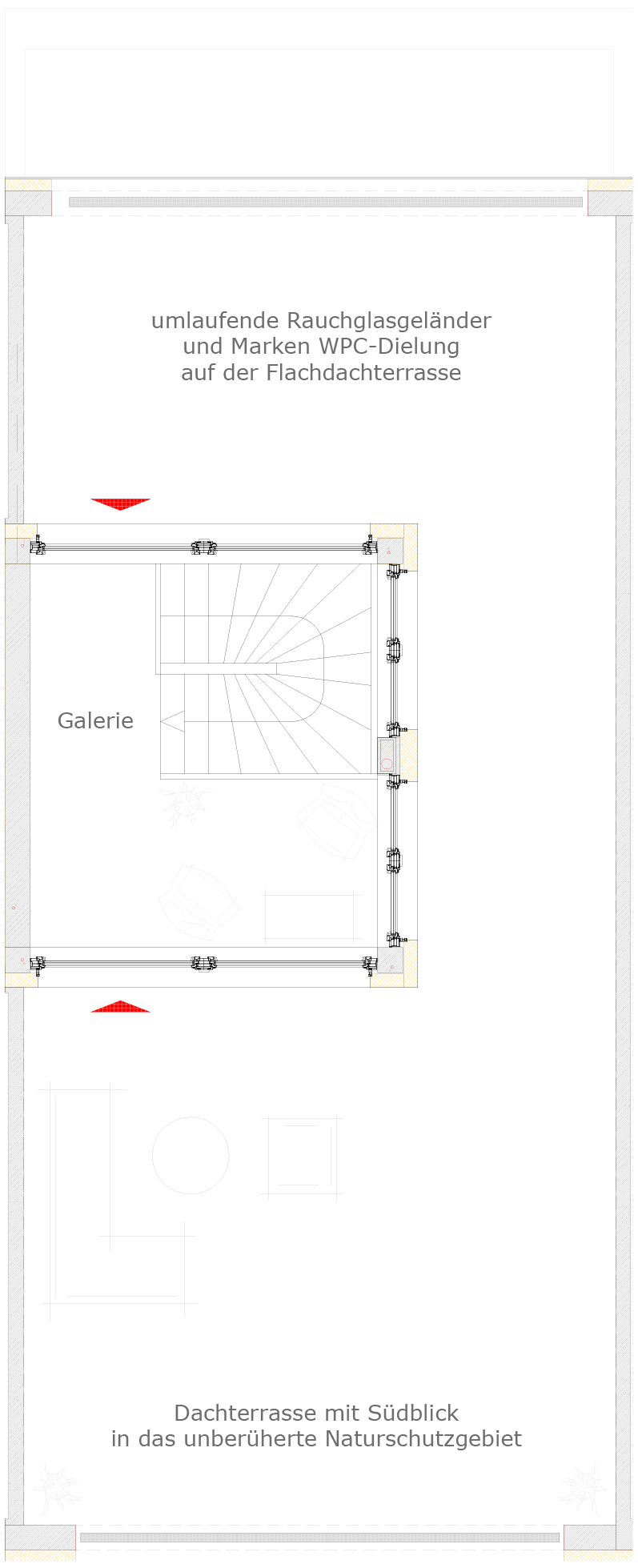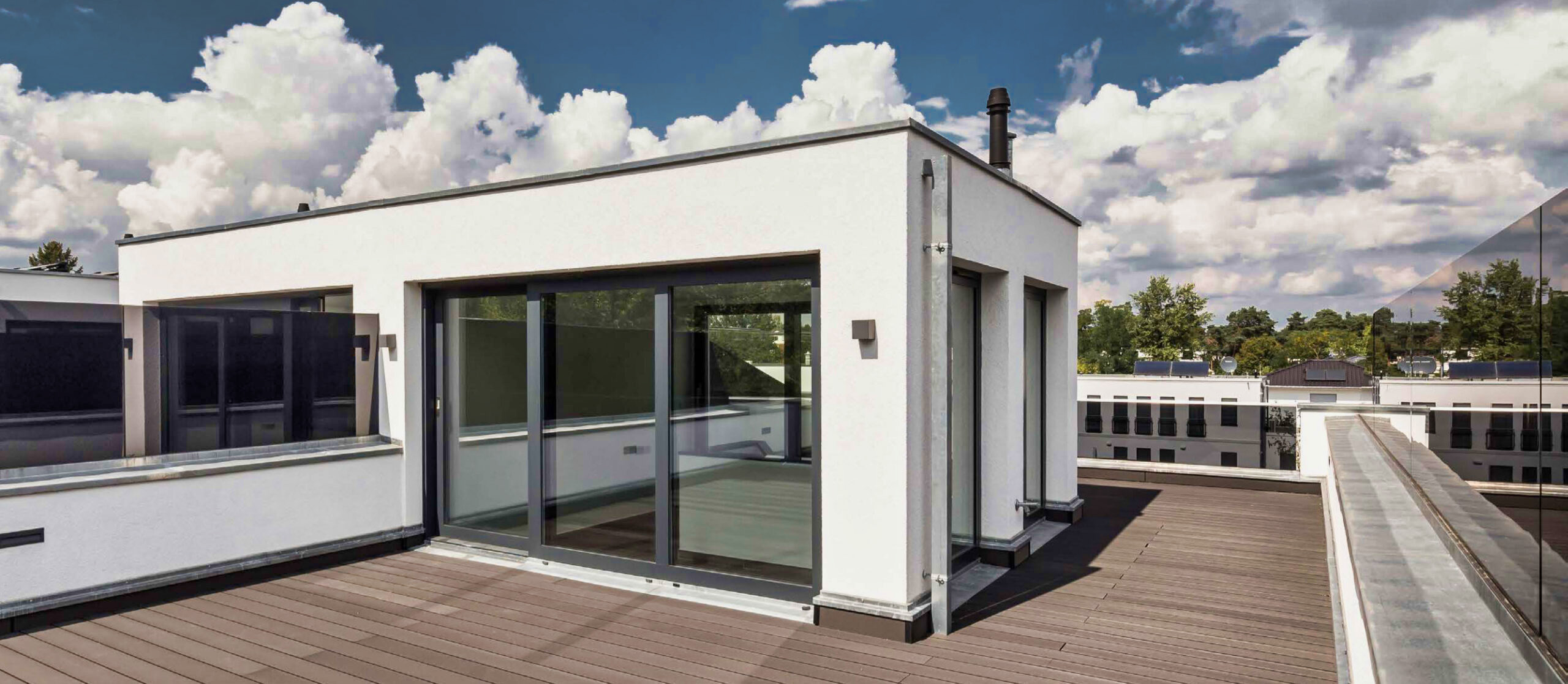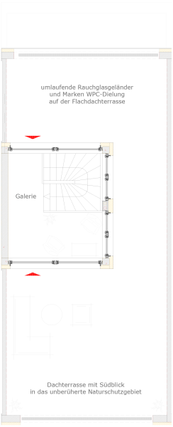 Die Dachterrassen sind durch rauchfarbenes undurchsichtiges Sicherheitsglas auf einer Höhe von 1,80 Meter voreinander getrennt und daher vom Nachbarn nicht einsehbar.