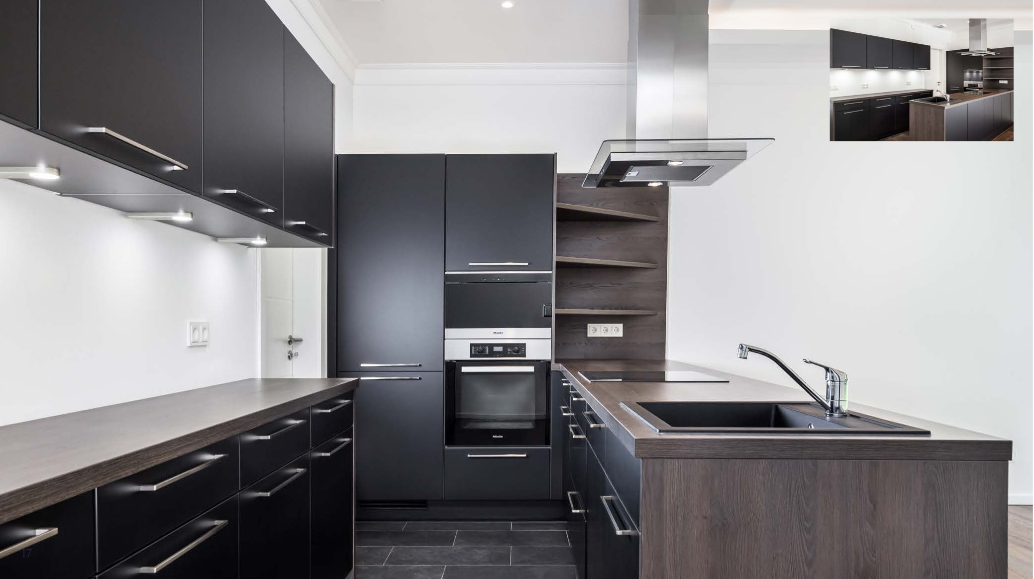 KÜCHE | In der eigens für die Townhouses gestalteteten und mit allen technischen Details ausgestatteteten Markenküche finden Sie von Miele den Dampfgarer und den Backofen, ferner den Kühl-und Gefrierschrank, die Geschirrspülmaschine, Induktionsherd mit Dunstabzugshaube, Spüle, Mülleimer und ausreichend Stauraum in den Küchenschränken.