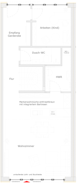Im Erdgeschoß separat und im Obergeschoß mit dem Kinder-, Arbeits- oder Gästezimmer verbunden, gibt es jeweils ein Duschbad mit Waschbecken, Toilette und Handtuchwärmer. Die Wände der Sanitärräume sind überwiegend mit weißen modernen Fliesen und die Fußböden mit den anthrazitfarbenden mit feiner Schieferstruktur gepressten Fliesen versehen. Die Grenzbereiche der Fliesen haben Edelstahlschienen. In allen Sanitärräumen sind auch schon die Toilettenbüsten und Toilettenpapierhalter aus Edelstahl sowie Spiegel installiert und die Decken sind mit Spotligths als Basisbeleuchtung ausgestattet. Es ist für alles gesorgt!